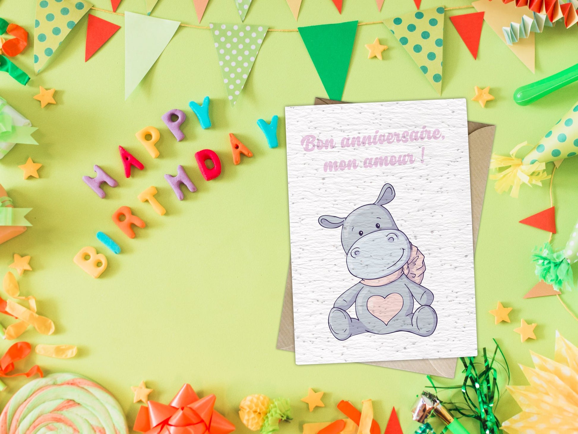 Carte originale et éco-responsable en papier ensemencé et son enveloppe Kraft.